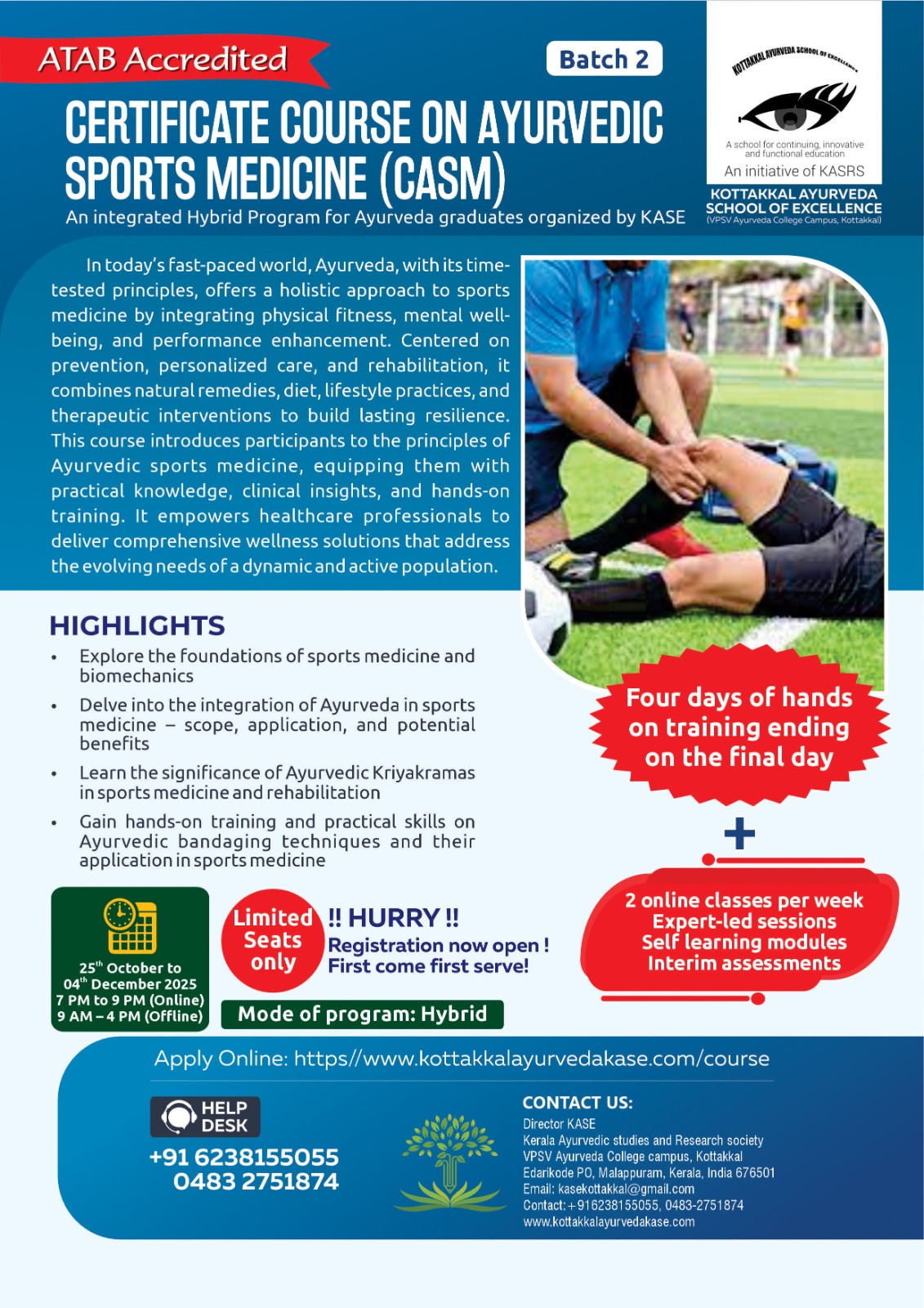 This course introduces participants to the principles of Ayurvedic sports medicine, equipping them with practical knowledge, clinical insights, and hands-on training. It empowers healthcare professionals to deliver comprehensive wellness solutions that address the evolving needs of a dynamic and active population