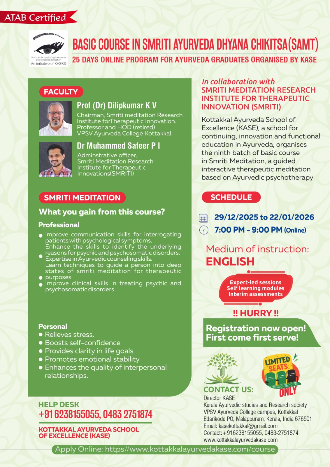 The course is designed to provide in-depth theoretical knowledge in Satvavajaya treatments and practical training in Smriti Ayurveda Meditation Therapy. The course is designed in such a way that the learners should undergo self-experience of the beneficent effect of the Therapy.